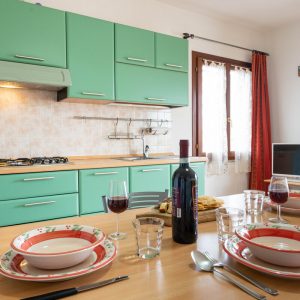 All’interno troviamo soggiorno/cucina attrezzata di tutto, frigorifero grande con congelatore, TV, divano, attrezzatura per la cucina.